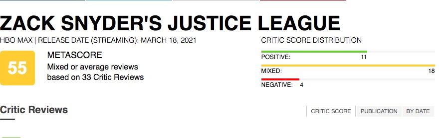 Con 33 reseñas recabadas, el 'Snyder Cut' promedia un no muy agradable 55, producto de 18 críticas "divididas", esto quiere decir que medios o especialistas le dieron una calificación entre 40 y 60; aunque se pueda alegar que un "6" no es reprobatorio, el sistema de Metacritic lo toma como tal.