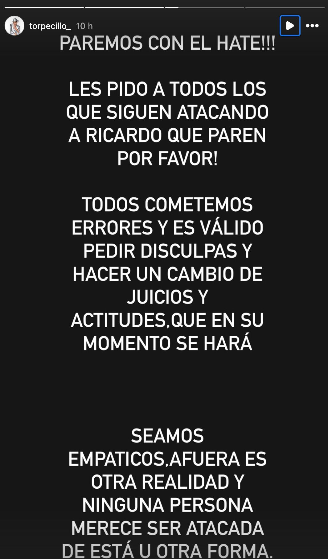 “Paremos con el hate. Les pido a todos los que siguen atacando a Ricardo que paren por favor”