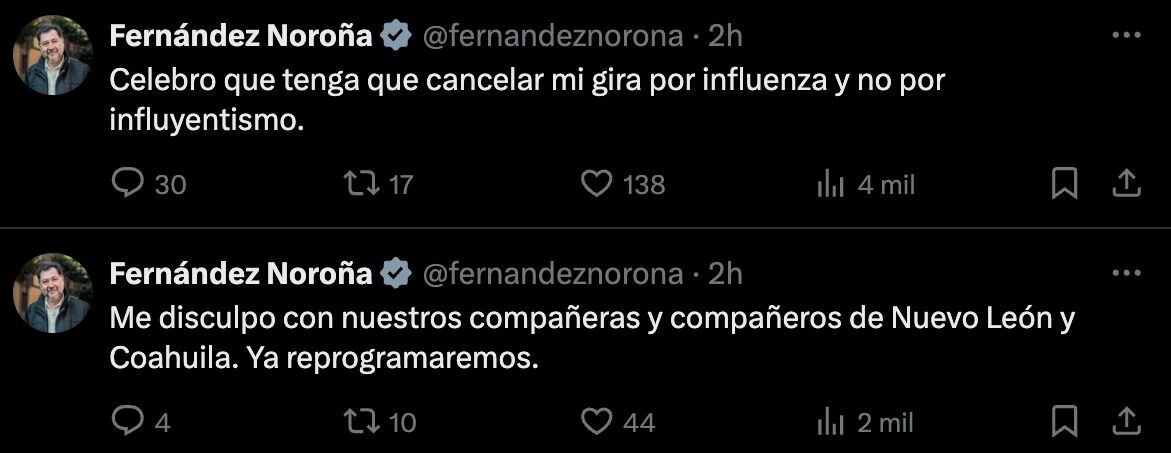 “Tengo programada una gira por Nuevo León y Coahuila a partir del jueves. Lamentablemente, el diagnóstico que me hicieron es que tengo influenza. Por lo tanto debo recluirme cinco días, no sólo para recuperarme, sino para evitar la propagación”, se lee en su publicación.