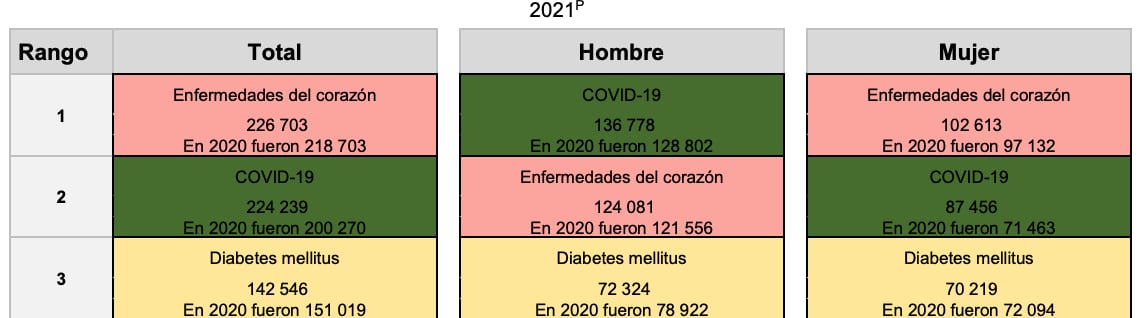 Asimismo, el Inegi determinó que las 3 principales causas de muerte en México en 2021 fueron: