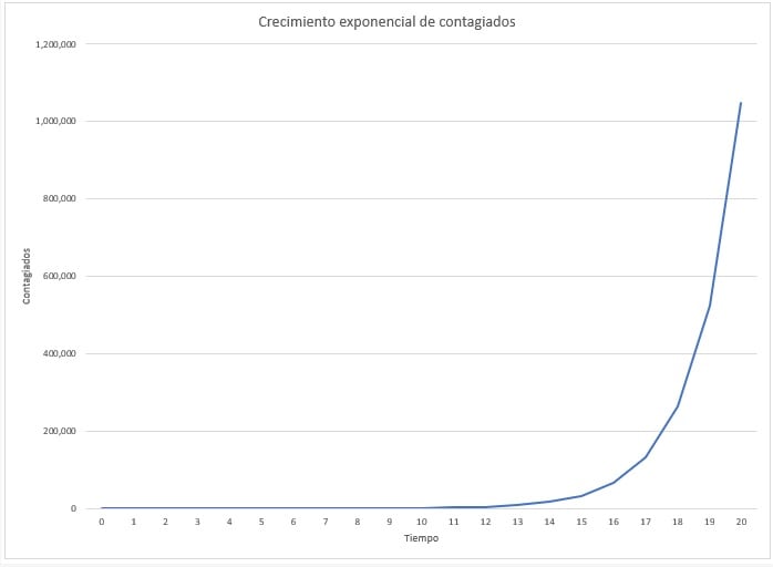 La forma de “J” de la curva es muy parecida a las gráficas que hemos estado viendo por esos tiempos sobre contagiados por coronavirus. En efecto, se trata de un crecimiento exponencial. Y para que se dé una idea del carácter explosivo de este proceso, en esta simulación de epidemia pasamos de una persona contagiada al inicio – tiempo 0 - a poco más de 1 millón de contagiados. Y todo, en tan sólo 20 días.