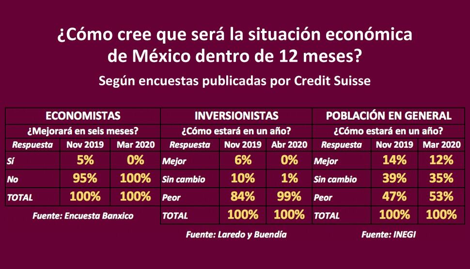- El porcentaje de inversionistas, de acuerdo a la encuesta de Laredo y Buendía, quienes ven el futuro económico del país peor o mucho peor, saltó de 84% en noviembre pasado, a 99% en abril. ¿Quiénes lo ven mejor dentro de un año ahora? O% amigos (y apenas 6% en noviembre 2019).