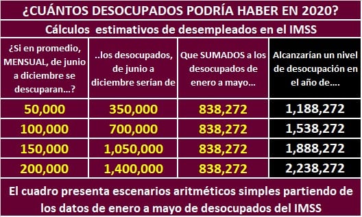 La idea es simple. Para calcular, no en un modelo econométrico sino en sencillos cálculos el tamaño probable de la desocupación en México para el 2020, a los 832 mil 272 que ya fueron dados de baja, hay que sumarle los posibles despidos en los siete meses de junio a diciembre.