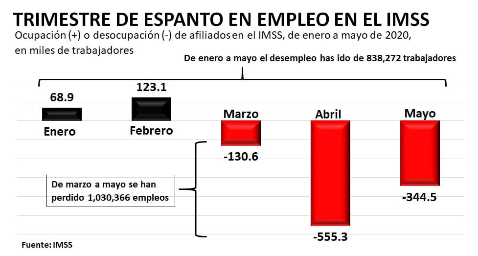Pero tomando en cuanto que en enero y febrero sopló aire fresco y se crearon 192 mil empleos, en el neto, restando al millón y piquito de descalabros laborales del trimestre, estos 192 mil, fueron despedidos en forma fulminante por la crisis 838 mil 272 mexicanos en cinco meses.
