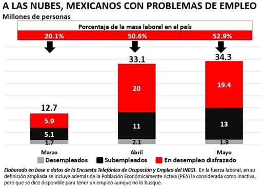 De modo que el número de mexicanos con problemas de empleo creció en dos meses de 12.7 millones a 34.3 millones.
