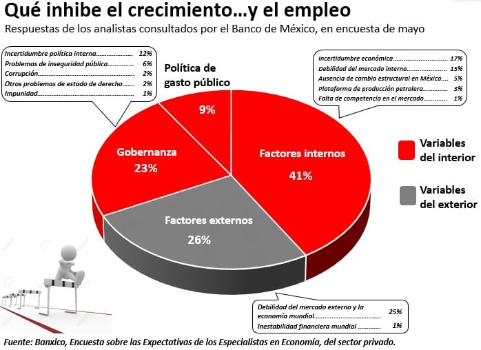 Los expertos que consulta Banxico -que sí saben de lo que hablan- apuntan hacia factores internos, como la principal causal, para reencauzar la actividad productiva, y el empleo.
