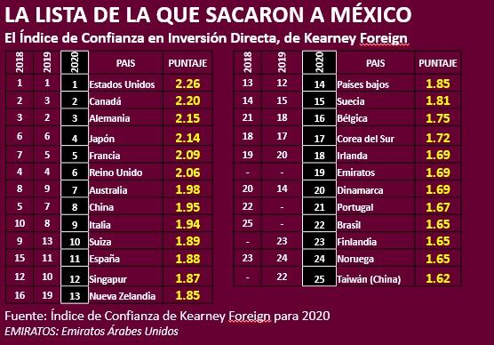 En el 2019, el primer año de gobierno de AMLO, hubo una gota de confianza, quedando México en la rayita, en el lugar 25. Ahora fue sacado del listado. En 2011, en el sexenio de Calderón, fue también excluido, pero luego recuperó el acceso, al grado de que en 2015 -en el tercer año del gobierno neoliberal de Peña- subió hasta el sitio 15.