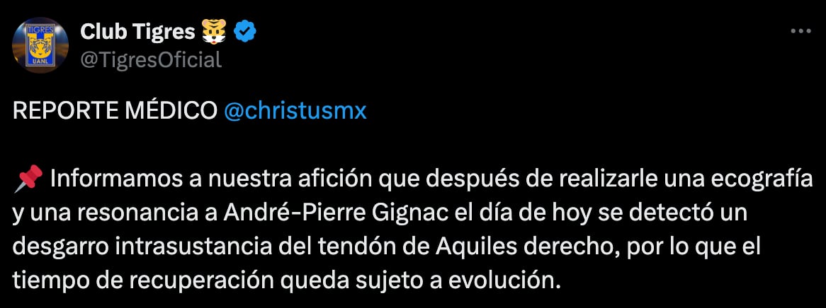 “Informamos a nuestra afición que después de realizarle una ecografía y una resonancia a AndrécPierre Gignac el día de hoy se detectó un desgarro intrasustancia del tendón de Aquiles derecho, por lo que el tiempo de recuperación queda sujeto a evolución”, publicó Tigres en su cuenta de X.