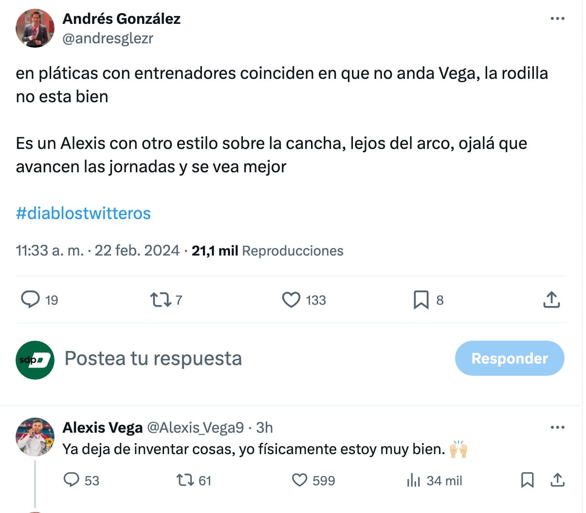A través de su cuenta de X, Andrés González había publicado que Alexis Vega no está al 100 por ciento por la lesión de su rodilla, por lo que el jugador del Deportivo Toluca le respondió en la misma red social.