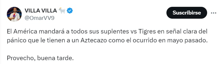 “El América mandará a todos sus suplentes vs Tigres en señal clara del pánico que le tienen a un Aztecazo como el ocurrido en mayo pasado”, escribió Villa Villa en su cuenta de X.