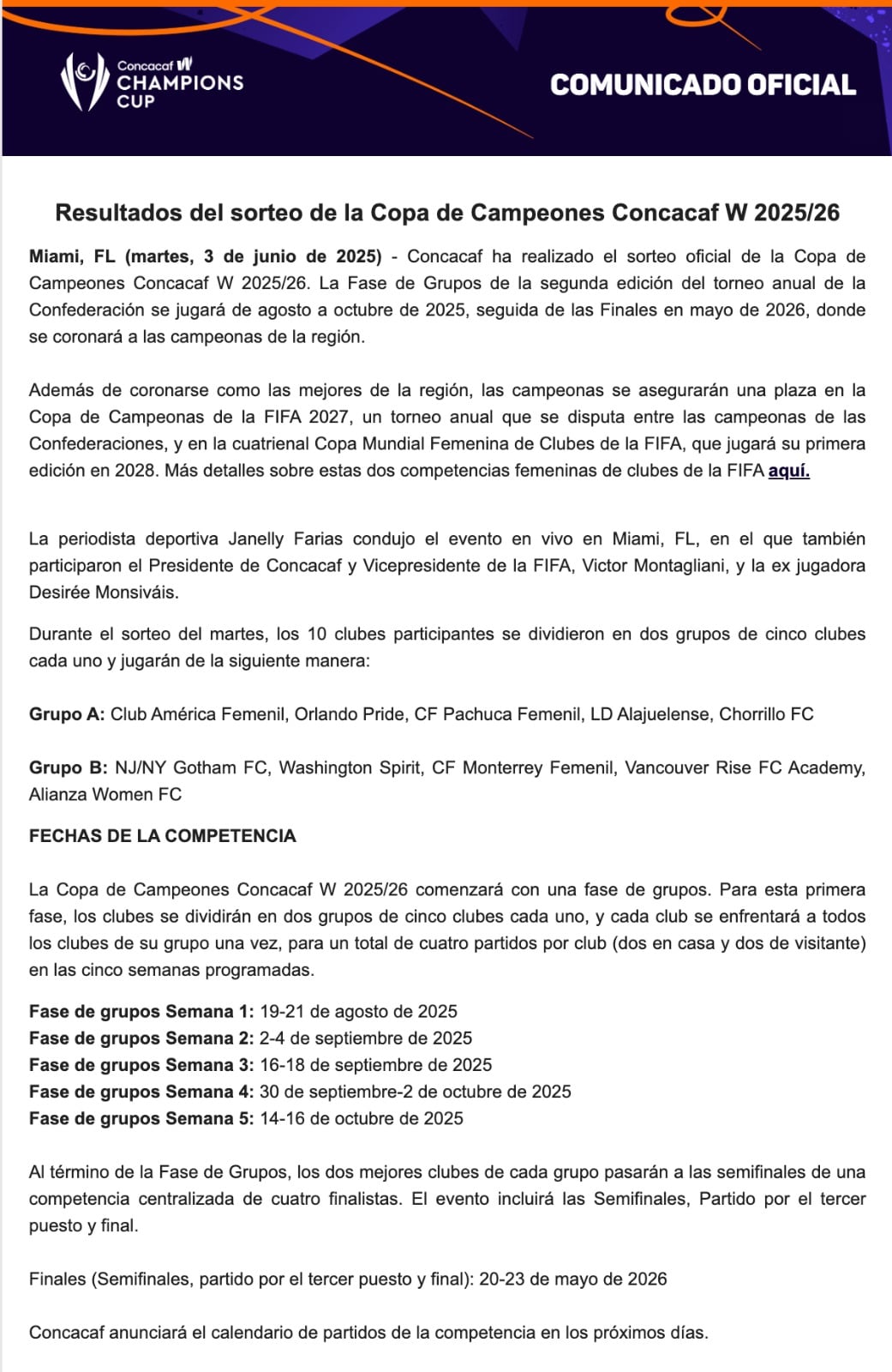 Lo único que se ha estipulado son las fechas de inicio y fin de cada fase de esta Concachampions 2026, por lo que esta es la única información que por ahora tienen América Femenil, Rayadas y Pachuca.