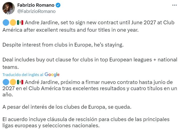 “André Jardine, próximo a firmar nuevo contrato hasta junio de 2027 en el Club América tras excelentes resultados y cuatro títulos en un año. A pesar del interés de los clubes de Europa, se queda. El acuerdo incluye cláusula de rescisión para clubes de las principales ligas europeas y selecciones nacionales”, escribió Fabrizio Romano en su cuenta de X.