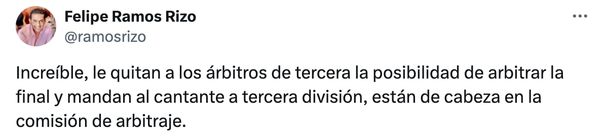 “Increíble, le quitan a los árbitros de tercera la posibilidad de arbitrar la final y mandan al cantante a tercera división, están de cabeza en la comisión de arbitraje”, escribió el ex árbitro mundialista.