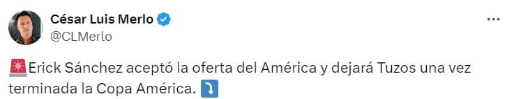 “Erick Chiquito Sánchez aceptó la oferta del Club América y dejará Tuzos una vez terminada la Copa América”, escribió César Luis Merlo en sus redes sociales.