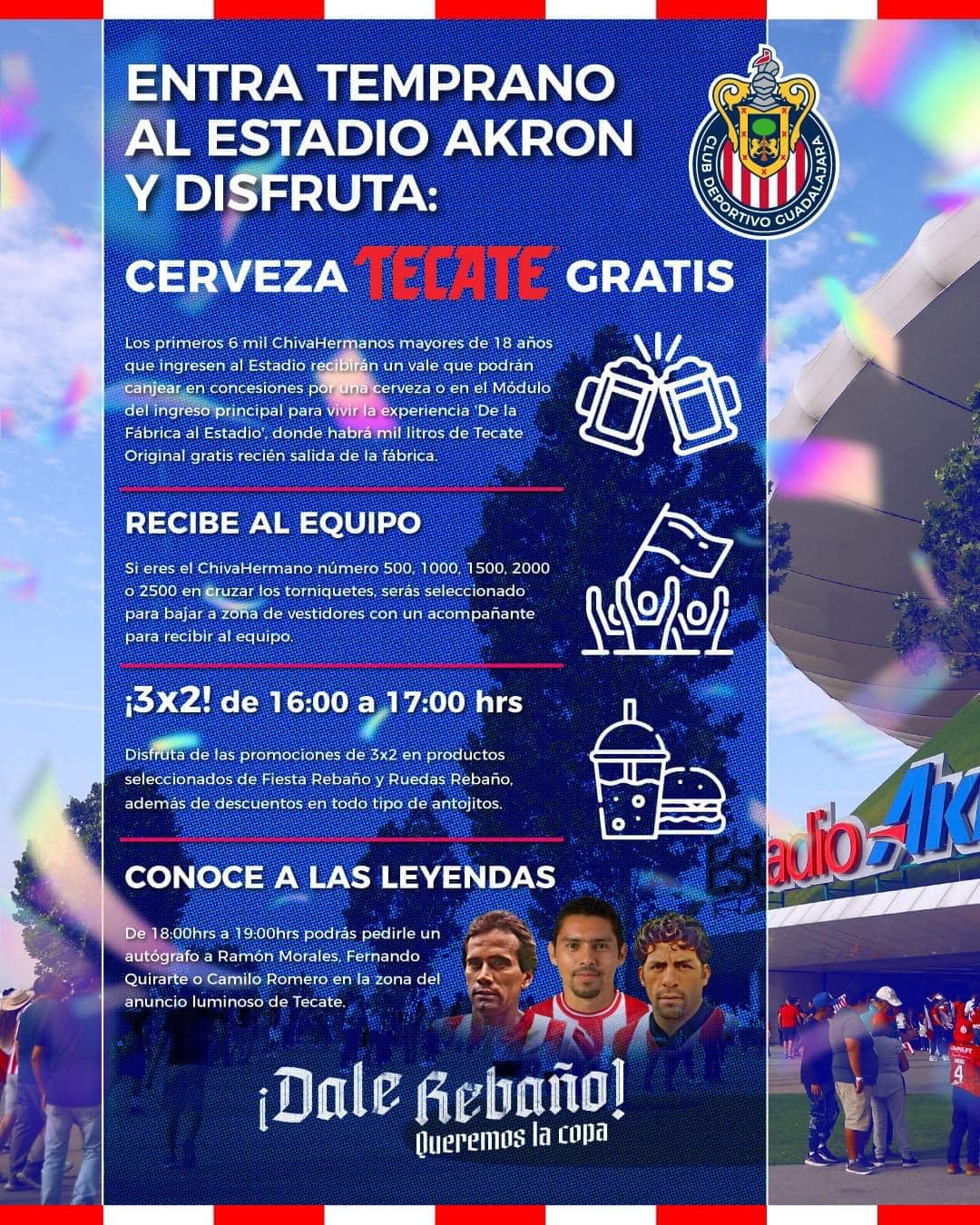 “Los primeros 6 mil Chivahermos mayores de 18 años que ingresen al Estadio recibirán un vale que podrán canjear en concesiones por una cerveza en el Módulo de ingreso principal, donde habrá mil litros de Tecate Original gratis”, escribió el Rebaño Sagrado en un comunicado.