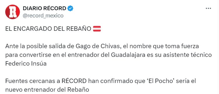 Federico El Pocho Insúa se convertiría en el nuevo director técnico de Chivas en caso de que Fernando Gago tome la decisión de salir del equipo para llegar a Boca Juniors.