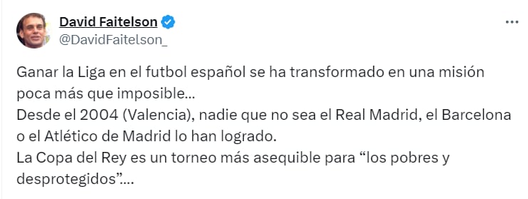 “Ganar la Liga en el futbol español se ha transformado en una misión poca más que imposible… Desde el 2004 (Valencia), nadie que no sea el Real Madrid, el Barcelona o el Atlético de Madrid lo han logrado. La Copa del Rey es un torneo más asequible para “los pobres y desprotegidos”, escribió David Faitelson.