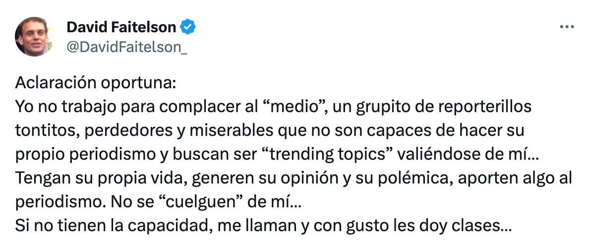 “Aclaración oportuna: Yo no trabajo para complacer al “medio”, un grupito de reporterillos tontitos, perdedores y miserables que no son capaces de hacer su propio periodismo y buscan ser “trending topics” valiéndose de mí… Tengan su propia vida, generen su opinión y su polémica, aporten algo al periodismo. No se “cuelguen” de mí… Si no tienen la capacidad, me llaman y con gusto les doy clases”, escribió David Faitelson.