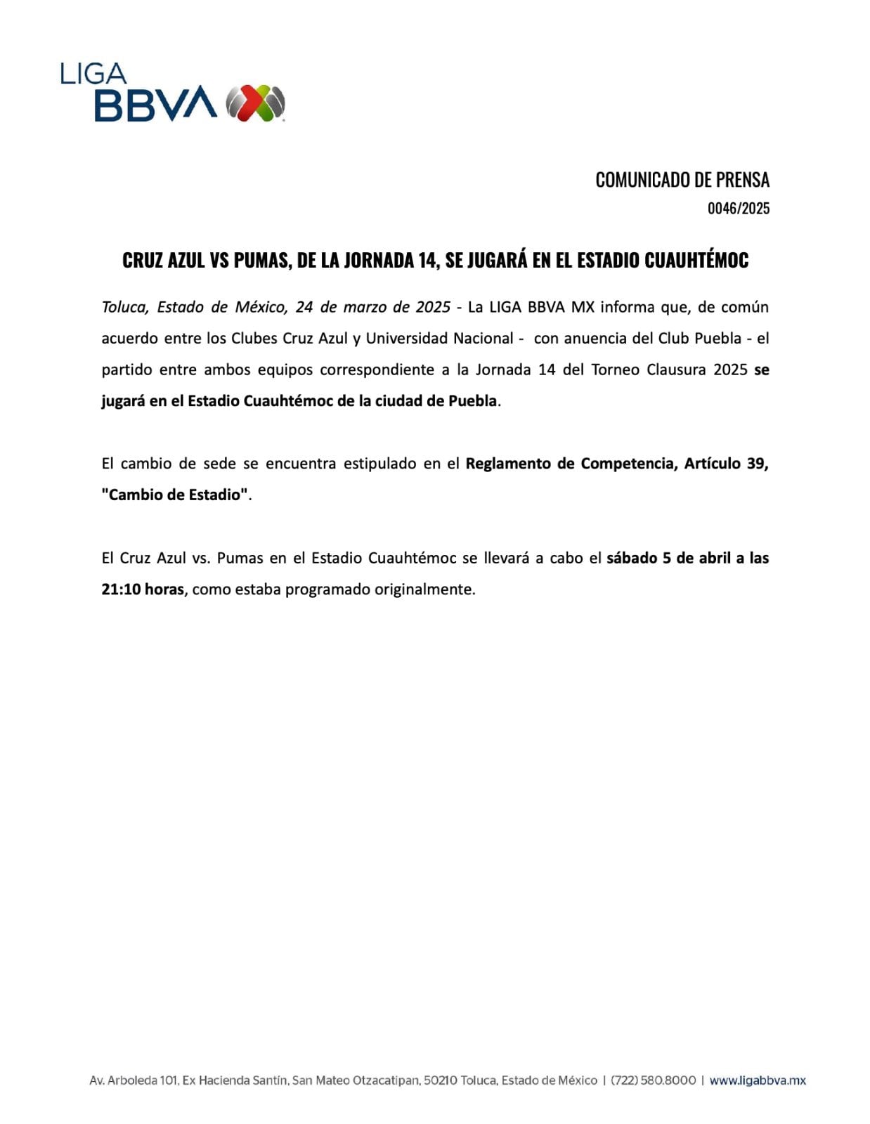 “La Liga MX informa que, de común acuerdo entre los Clubes Cruz Azul y Universidad Nacional con la aprobación del Club Puebla, el partido entre ambos equipos correspondiente a la Jornada 14 del Torneo Clausura 2025 se jugará en el Estadio Cuauhtémoc de la ciudad de Puebla”, se lee en el comunicado.