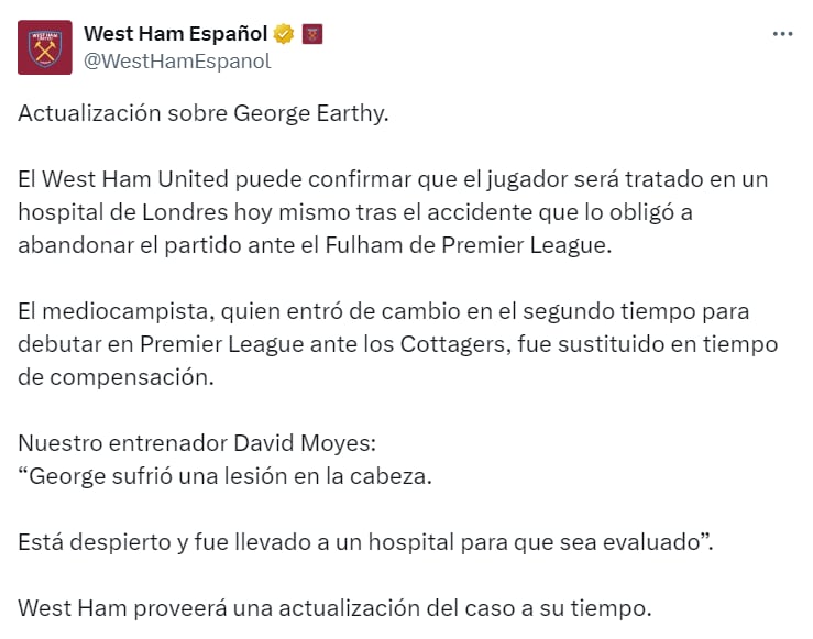 “El West Ham United puede confirmar que el jugador será tratado en un hospital de Londres hoy mismo tras el accidente que lo obligó a abandonar el partido ante el Fulham de Premier League”, se lee en la publicación.