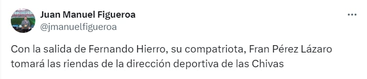 De acuerdo a información de Juan Manuel Figueroa, periodista de Mediotiempo, Fran Pérez Lázaro tomaría el lugar de Fernando Hierro como director deportivo del Club Chivas.
