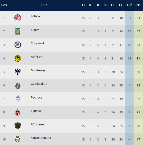 El sexto mejor posicionado por ahora es Chivas. El Rebaño ha escalado posiciones hasta estar en zona de Liguilla directa y su futuro está en sus manos; sin embargo, debajo de ellos tienen a Pachuca (a quien enfrentarán este fin de semana), Bravos y en menor medida a Santos, que en puntos todavía podría empatarlos.