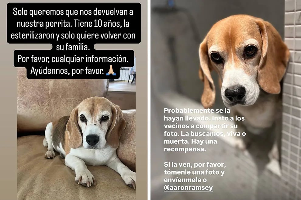 Luego de días sin saber nada sobre el paradero de su perrita, la esposa de Aaron Ramsey pidió a sus seguidores que, en caso de ver a Halo, le tomen una foto y se la manden. Considera que, posiblemente, alguien se la llevó, así que esperan dar con ella ya sea viva o muerta.