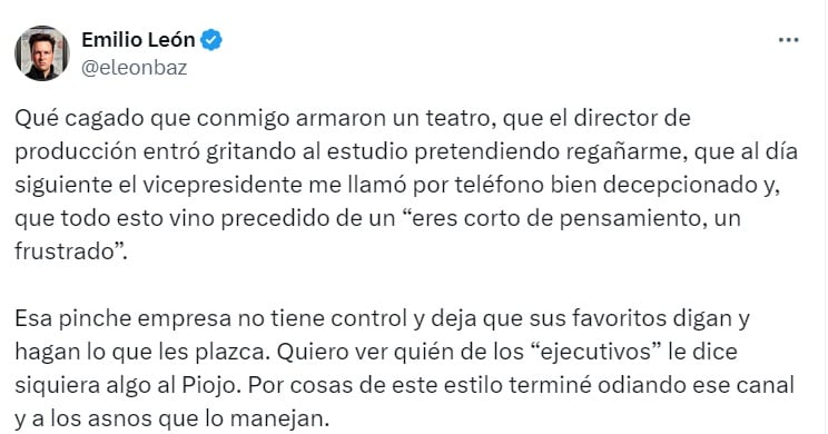 “Esa pinche empresa no tiene control y deja que sus favoritos digan y hagan lo que les plazca. Quiero ver quién de los “ejecutivos” le dice siquiera algo al Piojo. Por cosas de este estilo terminé odiando ese canal y a los asnos que lo manejan”, agregó.