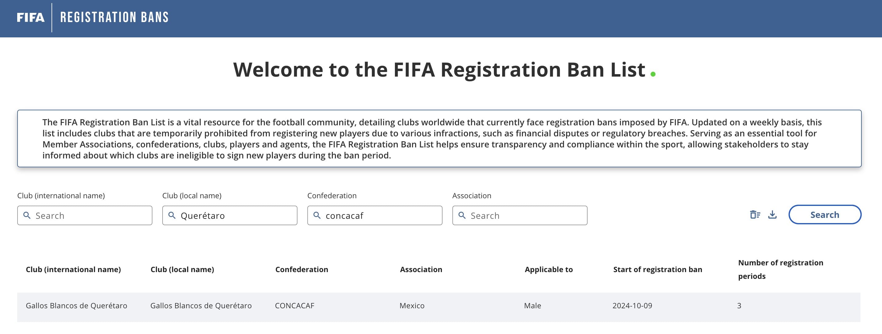 La FIFA sorprendió a todos al anunciar que el Querétaro de la Liga MX ingresó a la Lista de Prohibiciones de Registro, por lo que quedan inhabilitados para contratar jugadores en tres mercados de fichajes.