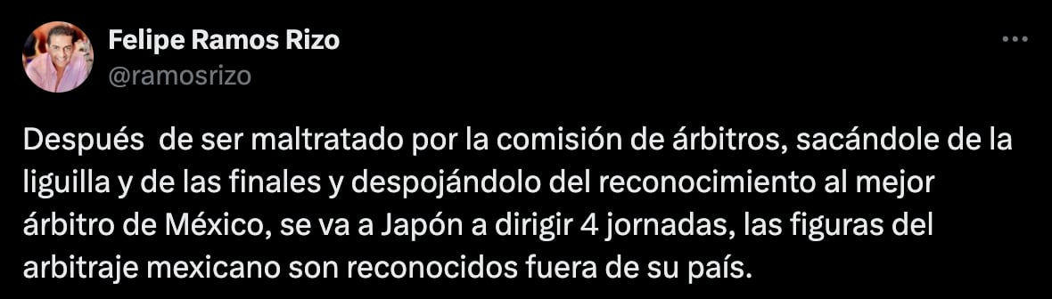 “Después de ser maltratado por la comisión de árbitros, sacándole de la liguilla y de las finales y despojándolo del reconocimiento al mejor árbitro de México, se va a Japón a dirigir 4 jornadas, las figuras del arbitraje mexicano son reconocidos fuera de su país”, escribió en su cuenta de X.