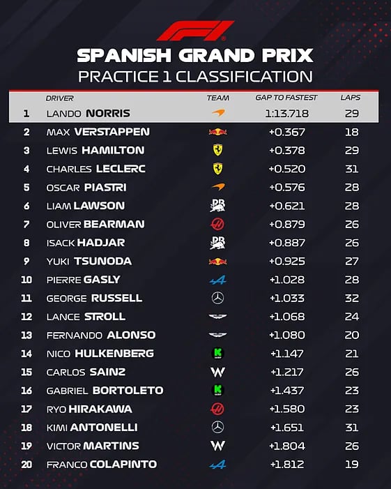 Luego de completar la primera sesión de prácticas libres, las escuderías tuvieron la oportunidad de obtener toda la información necesaria para tratar de obtener el mejor rendimiento a lo largo del fin de semana, particularmente el domingo que se corra el Gran Premio de España 2025 de la Fórmula 1.