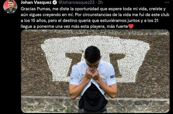 Johan Vásquez le dio las gracias a los Pumas de la UNAM por darle la oportunidad que siempre quiso y por creer en su talento, el cual ahora lo lleva a la Serie A.