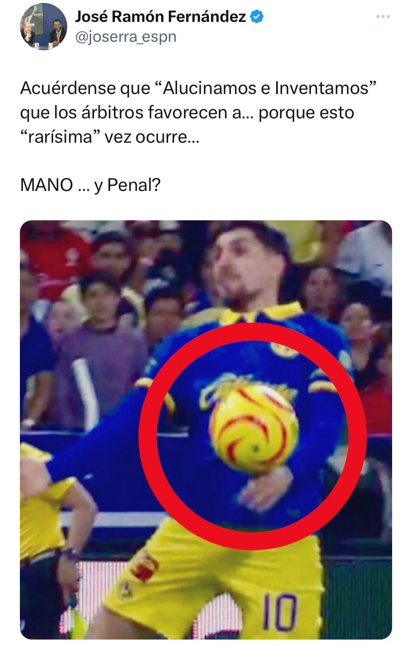 “Acuérdense que “Alucinamos e Inventamos” que los árbitros favorecen a… porque esto “rarísima” vez ocurre… MANO … y Penal?”, escribió el periodista de ESPN en su cuenta de X.
