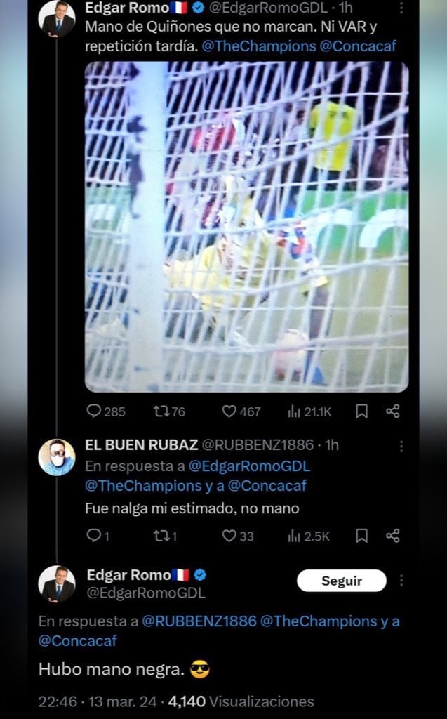 Varias personas publicaron una captura de pantalla donde Edgar Romo dice que “hubo mano negra” en un posible penal de Julián Quiñones ante el Club Chivas en la Concachampions.