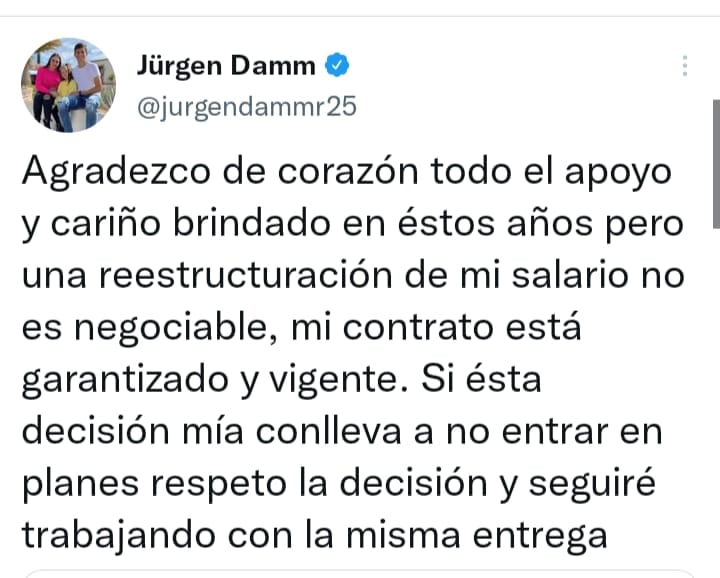 Asimismo, Jürgen Damm señaló que se enfoca en seguir entrenando por su cuenta y agradeció a los clubes que manifestaron interés por él, pero aseguró que por el momento no tiene un acuerdo cerrado.