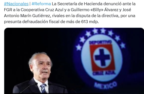 Este domingo 19 de octubre se dio a conocer que la Secretaría de Hacienda y Crédito Público interpuso una demanda ante la Fiscalía General de la República en contra de la Cooperativa Cruz Azul con el argumento de que existiría una defraudación fiscal por un monto que supera los 613 millones de pesos, todo esto en el año 2019, cuando aún estaba al frente de la empresa Billy Álvarez.