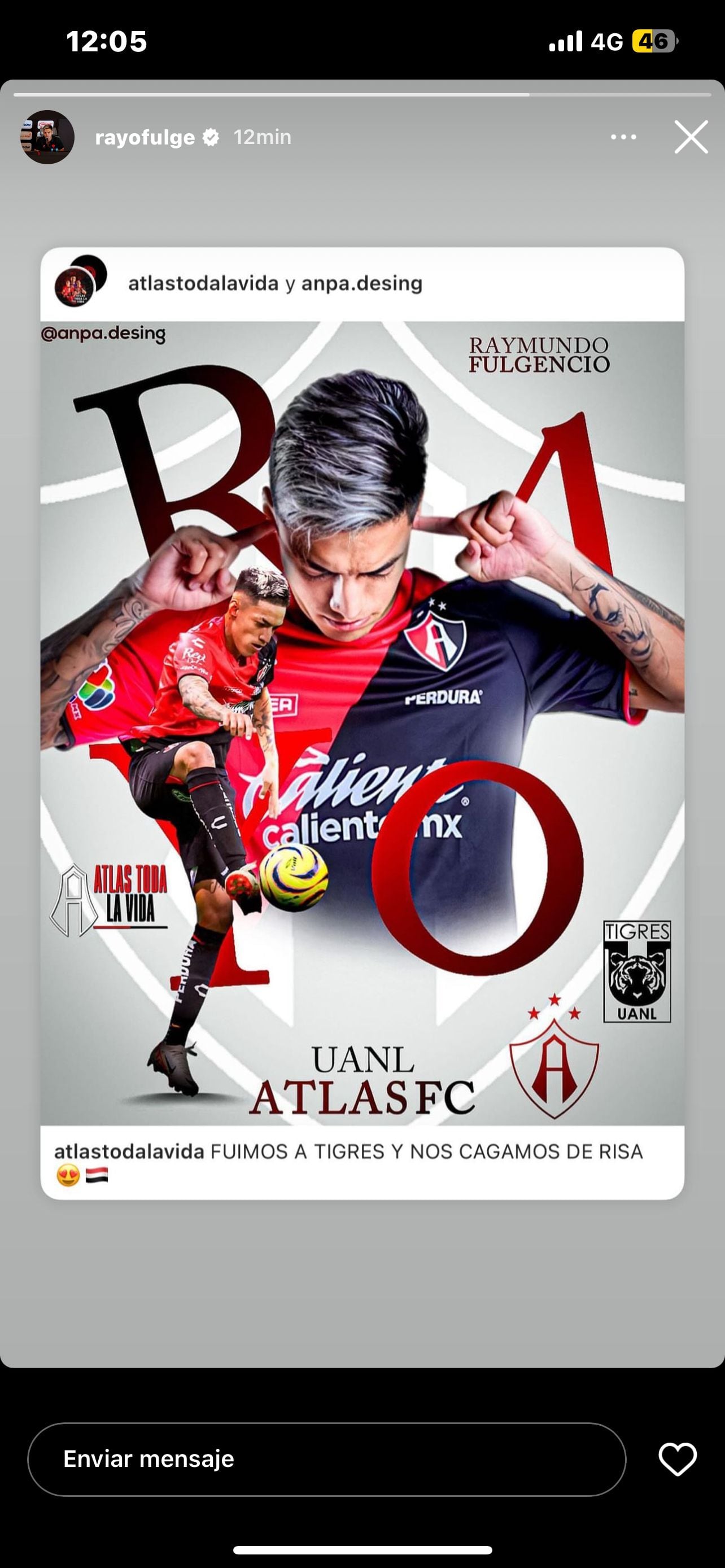 A unas horas de que Raymundo Fulgencio se enfrente a la Universidad Autónoma de Nuevo León, el jugador del Club Atlas compartió en sus historias una imagen con una frase que se puede interpretar como una burla a su ex equipo.