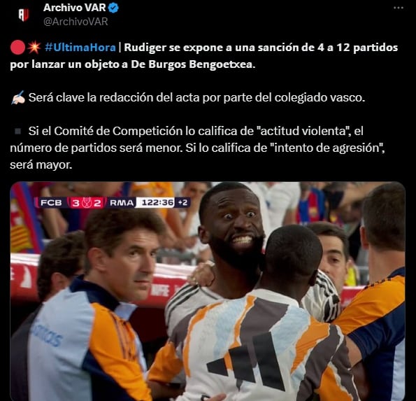 Si el árbitro que fue blanco de la agresión reporta que Rüdiger incurrió en una “actitud violenta”, el número de juegos de sanción no sería tan elevado; sin embargo, si de Burgos Bengoetxea califica lo sucedido como “intento de agresión”, Antonio podría recibir hasta 12 juegos de suspensión.