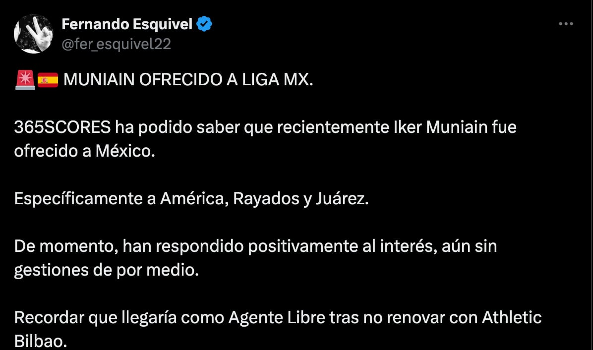 El mismo periodista informa que el representante de Iker Muniain ofreció al jugador a tres importantes equipos del futbol mexicano, quienes ven con buenos ojos la posible contratación del futbolista vasco.