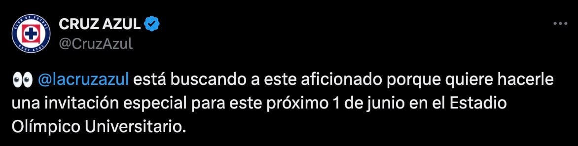 “Cemento Cruz Azul está buscando a este aficionado porque quiere hacerle una invitación especial para este próximo 1 de junio en el Estadio Olímpico Universitario”, se lee en el X de La Máquina.