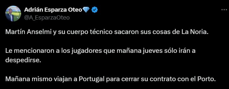 “Martín Anselmi y su cuerpo técnico sacaron sus cosas de La Noria. Le mencionaron a los jugadores que mañana jueves sólo irán a despedirse. Mañana mismo viajan a Portugal para cerrar su contrato con el Porto”, escribió el periodista en su cuenta de X.