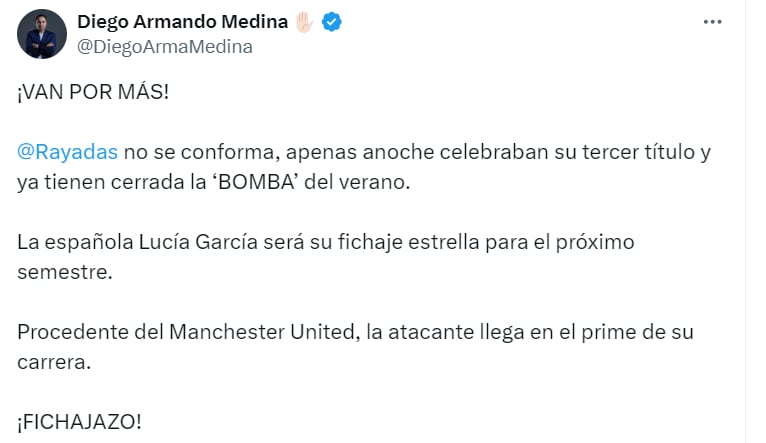 Y es que la directiva de Rayadas de Monterrey tendría la intención de fichar a Lucía García, jugadora del Manchester United, de acuerdo a información del reportero de TUDN Diego Armando Medina.