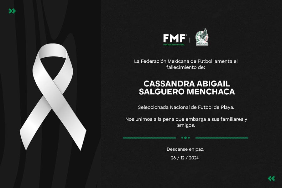 “La FMF y la Selección Nacional de Futbol de Playa Femenil lamenta el sensible fallecimiento de Cassandra Abigail Salguero Menchaca. Nos unimos al dolor de su familia y amigos”, se lee en el comunicado de la Federación Mexicana de Futbol.