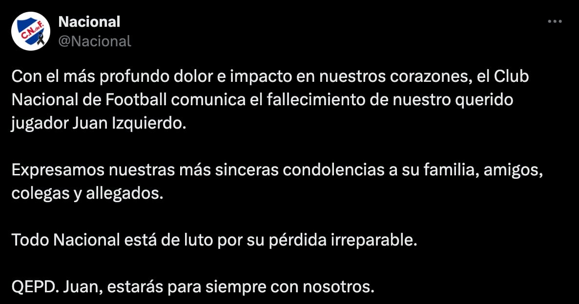 “Con el más profundo dolor e impacto en nuestros corazones, el Club Nacional de Football comunica el fallecimiento de nuestro querido jugador Juan Izquierdo. Expresamos nuestras más sinceras condolencias a su familia, amigos, colegas y allegados.