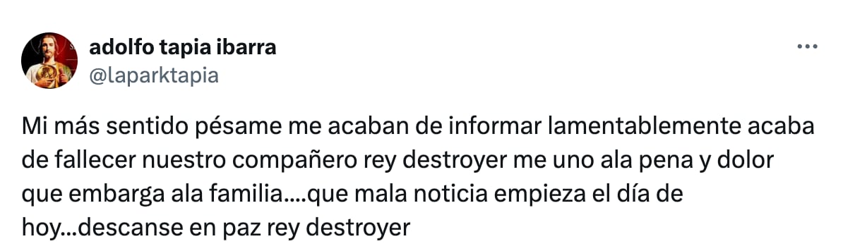 “Mi más sentido pésame, me acaban de informar lamentablemente acaba de fallecer nuestro compañero Rey Destroyer, me uno a la pena y dolor que embarga a la familia... Qué mala noticia empieza el día de hoy... Descanse en paz, Rey Destroyer”, se lee en la publicación de LA Park.