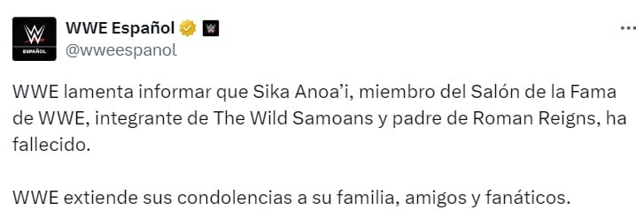 “WWE lamenta informar que Sika Anoa’i, miembro del Salón de la Fama de WWE, integrante de The Wild Samoans y padre de Roman Reigns, ha fallecido. WWE extiende sus condolencias a su familia, amigos y fanáticos”, se lee en comunicado de una de las empresas de wrestling más importantes del mundo.