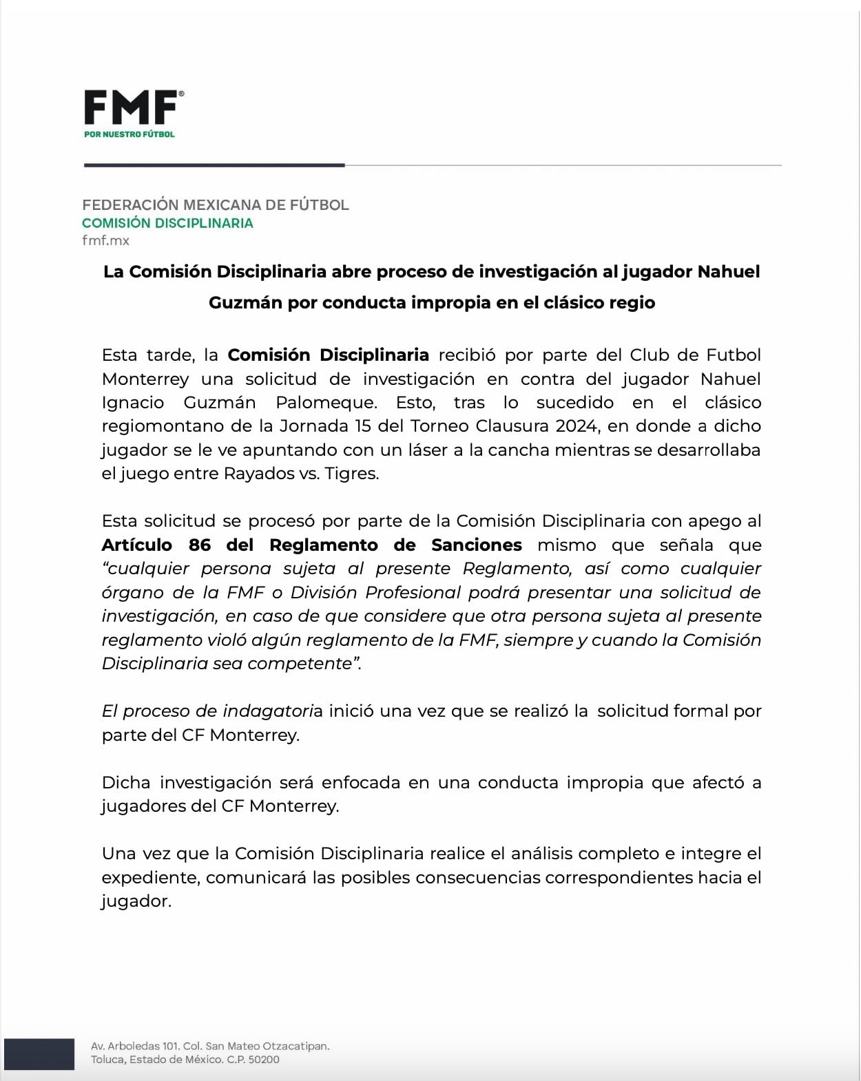 “El proceso de indagatoria inició una vez que se realizó la solicitud formal por parte del CF Monterrey. Dicha investigación será enfocada en una conducta inapropiada que afectó a jugadores del CF Monterrey”, es parte del comunicado.