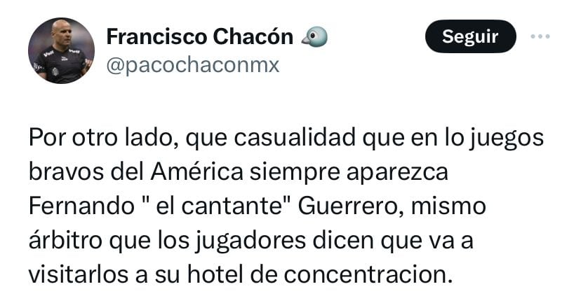 “Por otro lado, que casualidad que en lo juegos bravos del América siempre aparezca Fernando “el cantante” Guerrero, mismo árbitro que los jugadores dicen que va a visitarlos a su hotel de concentración”, escribió Paco Chacón en su cuenta de X.