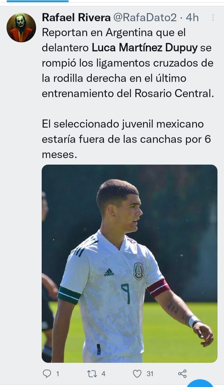 Luca Martínez Dupuy seleccionado mexicano Sub 20 que juega en el Rosario Central de la primera división de Argentina, sufrió una fuerte lesión que lo puede alejar de las canchas seis meses.