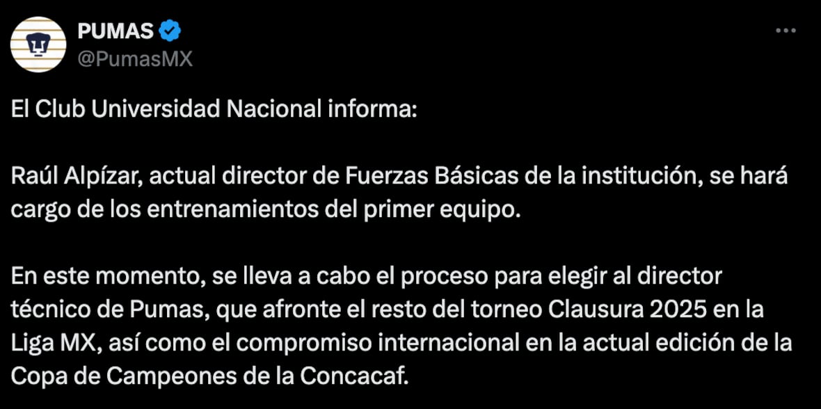 “El Club Universidad Nacional informa: Raúl Alpízar, actual director de Fuerzas Básicas de la institución, se hará cargo de los entrenamientos del primer equipo. En este momento, se lleva a cabo el proceso para elegir al director técnico de Pumas, que afronte el resto del torneo Clausura 2025 en la Liga MX, así como el compromiso internacional en la actual edición de la Copa de Campeones de la Concacaf”, se lee en el comunicado de Pumas.